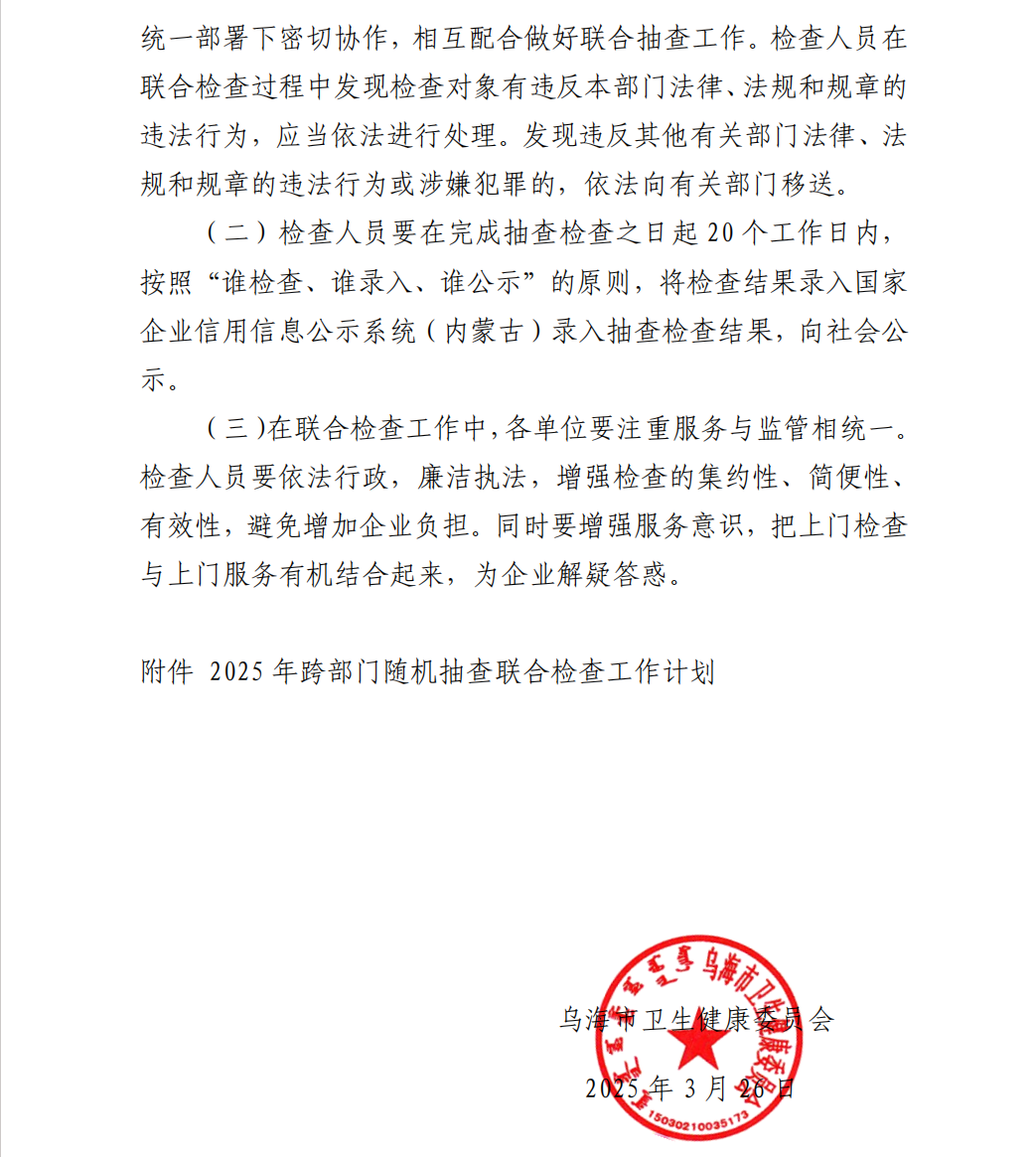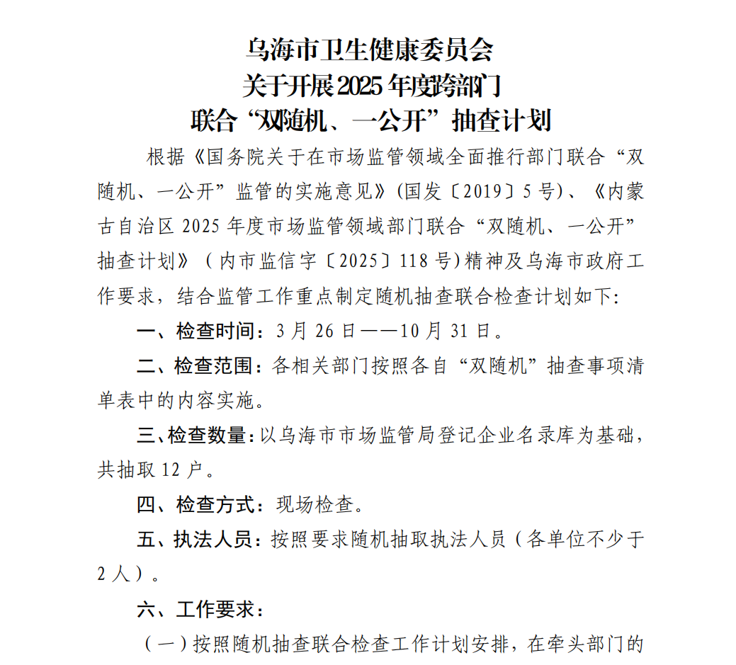 | 标 题 | 乌海市卫生健康委员会关于开展 2025 年度跨部门联合“双随机、一公开”抽查计划 | ||||||||
