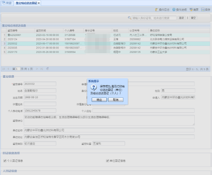 点击〖操作日志〗可对历史操作数据进行浏览、回退、打印劳动能力鉴定